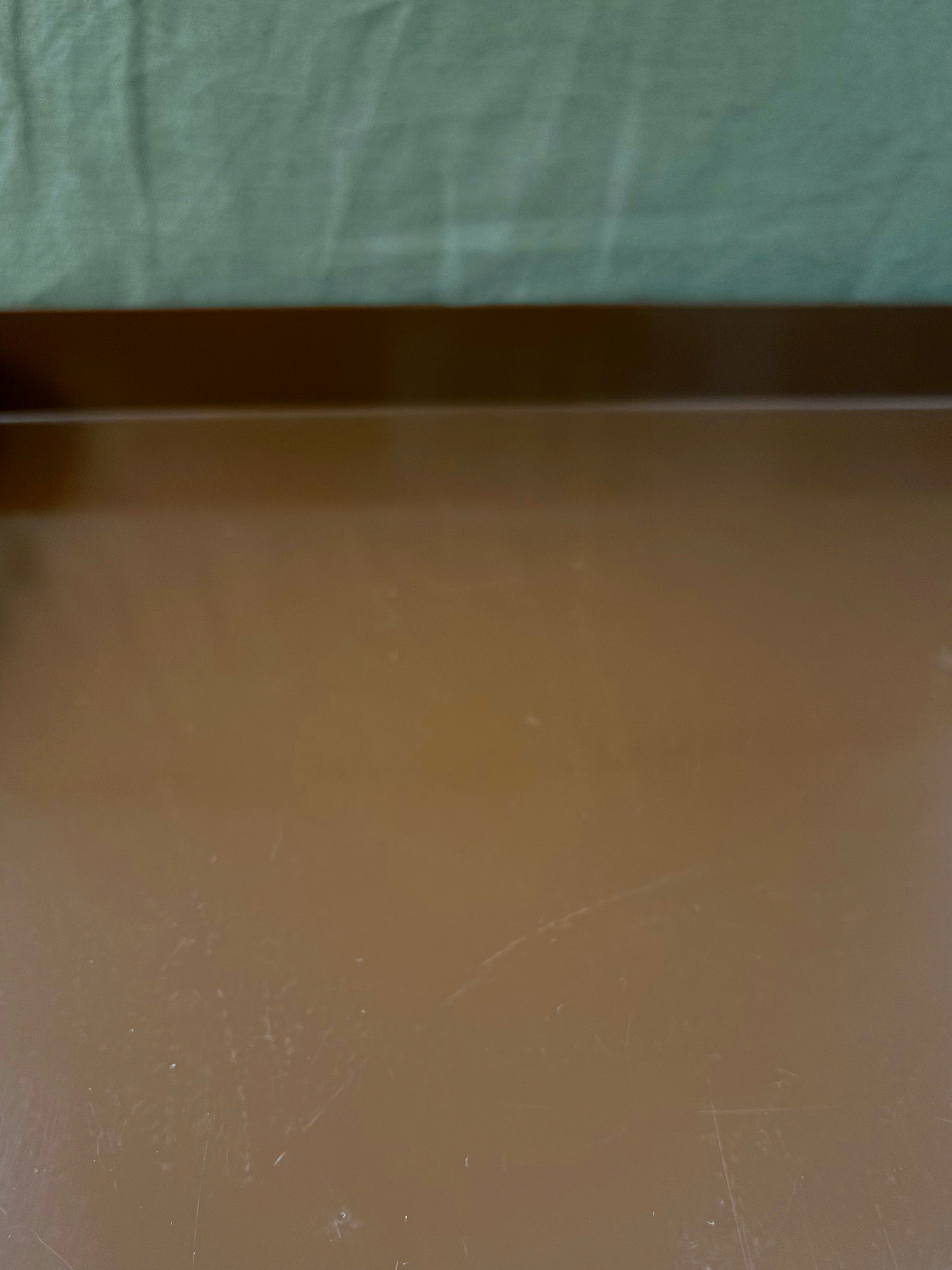 There are surface marks visible only depending on light and viewing angle. Its overall integrity, form, and everyday functionality remain unaffected.