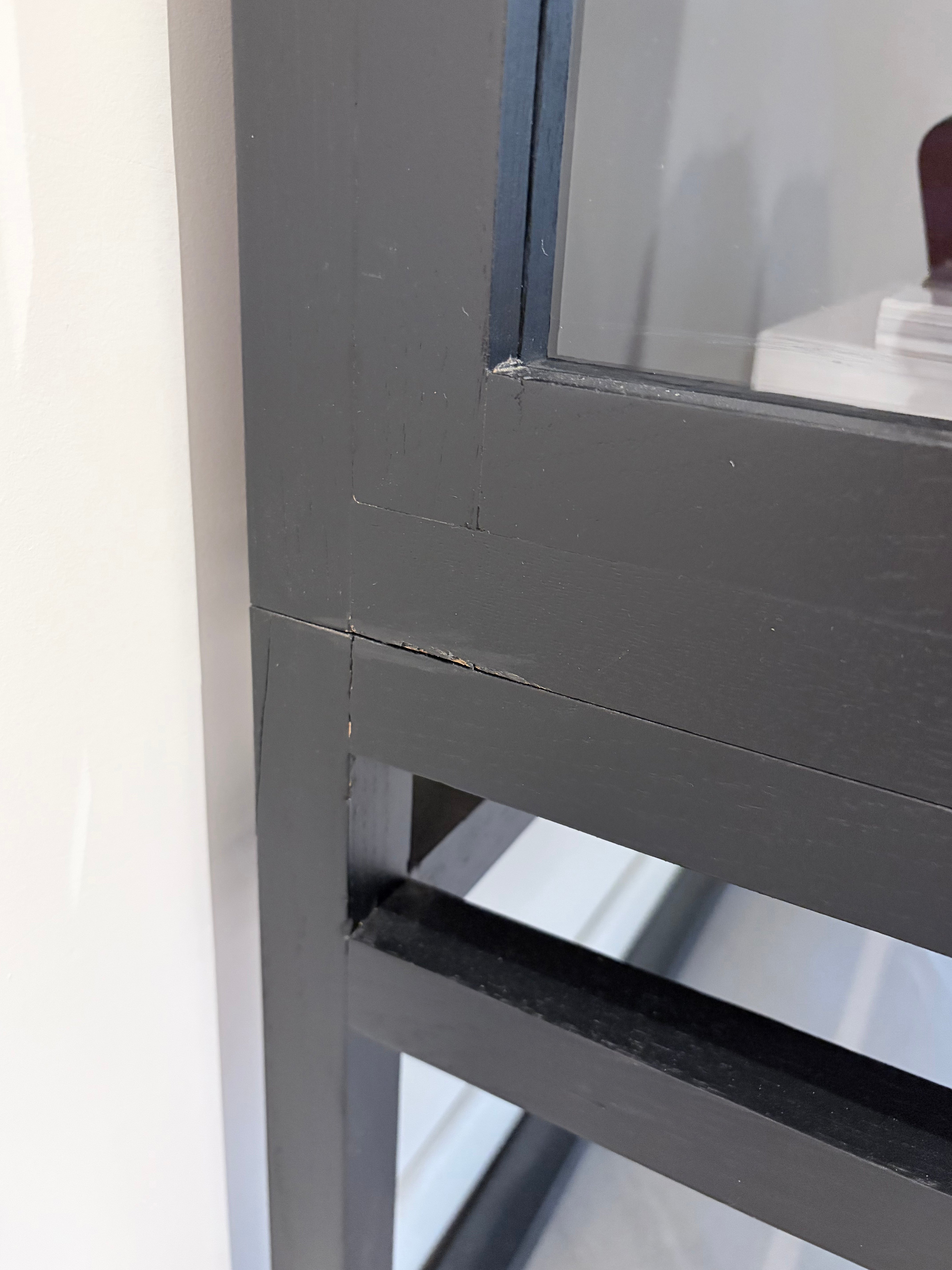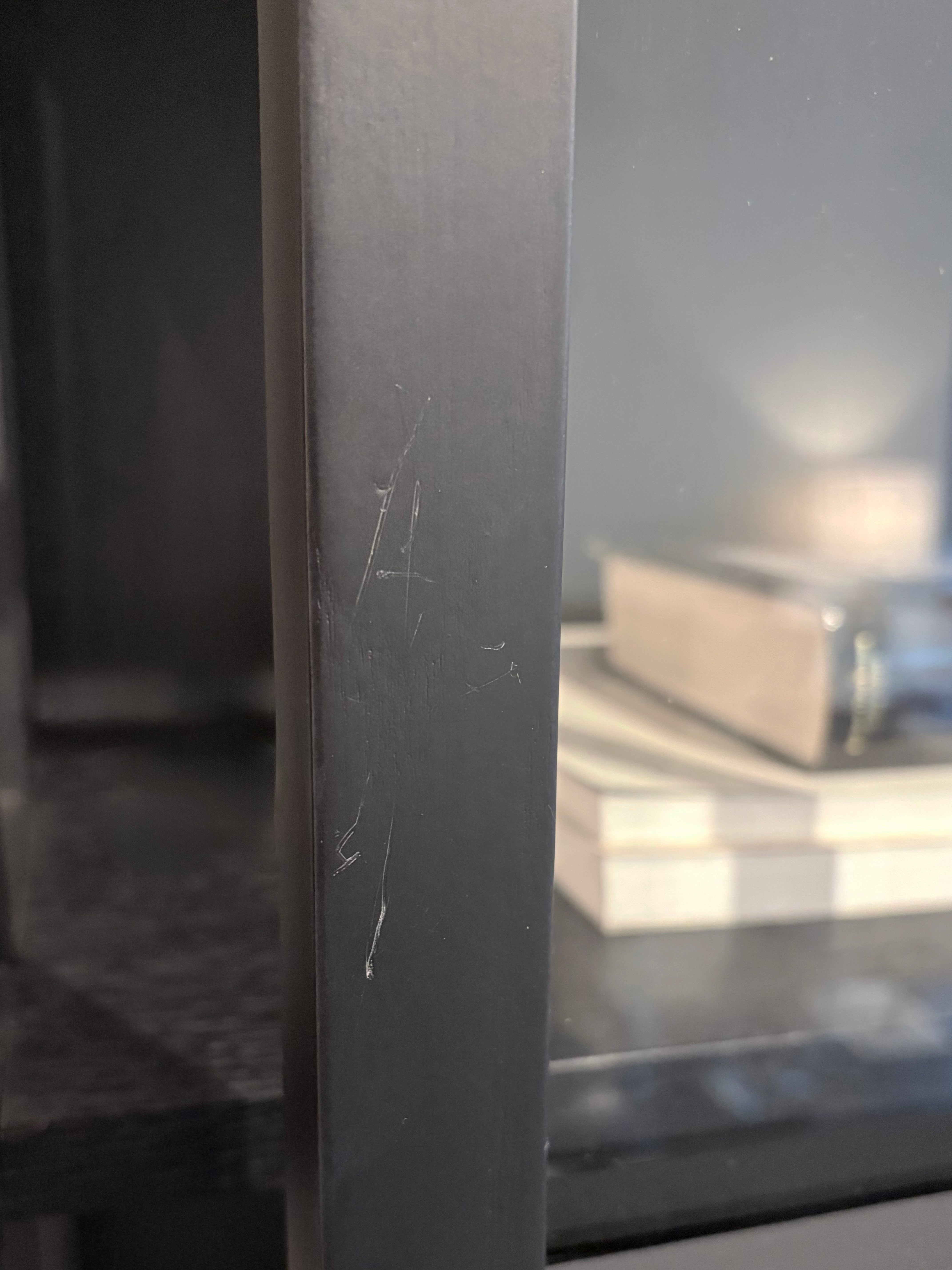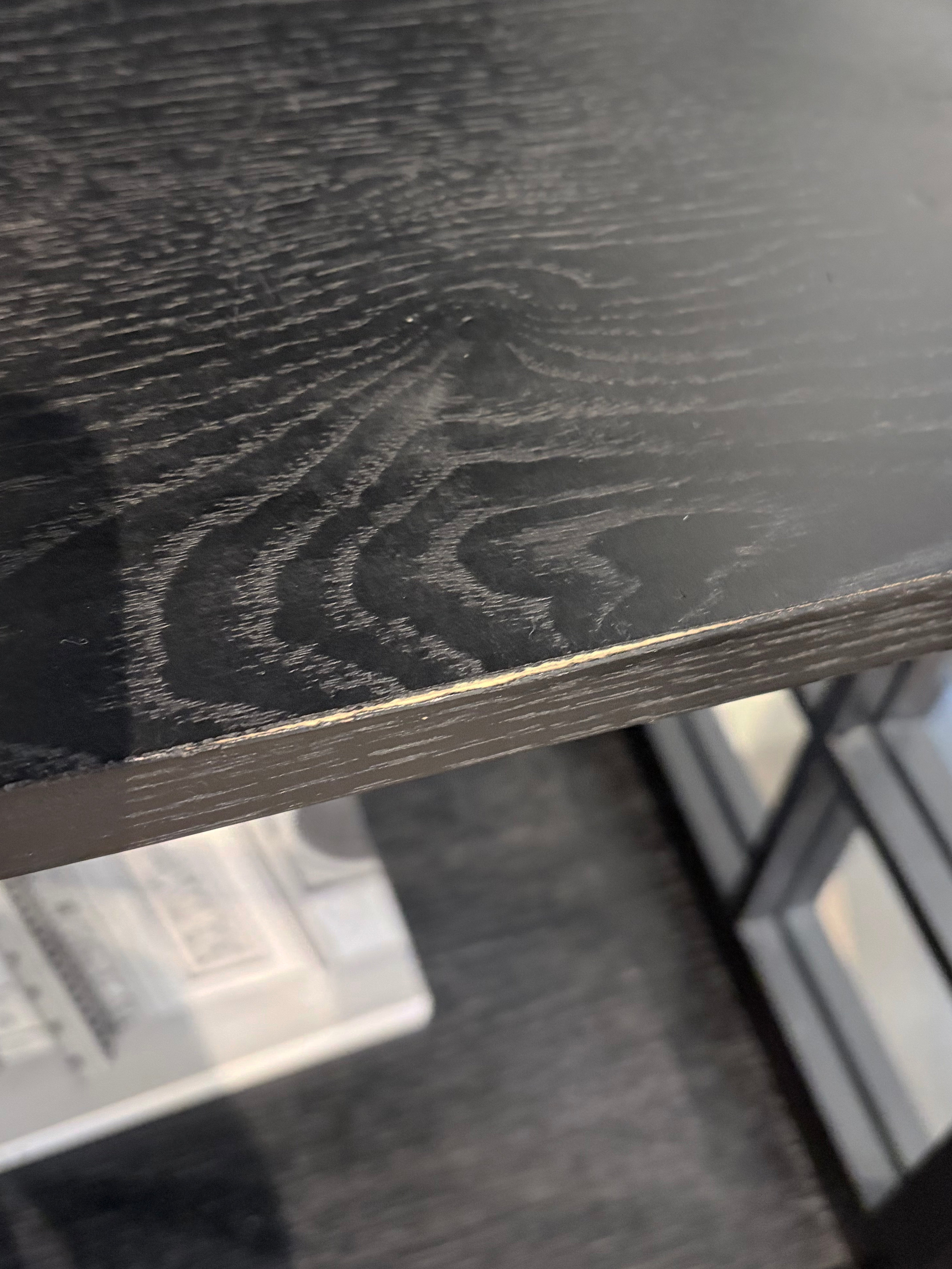 Since the piece was used in showroom display and photo shoots, there are minor surface deformations on the wood and light silicone marks on the glass. These do not affect its overall appearance or functional quality.