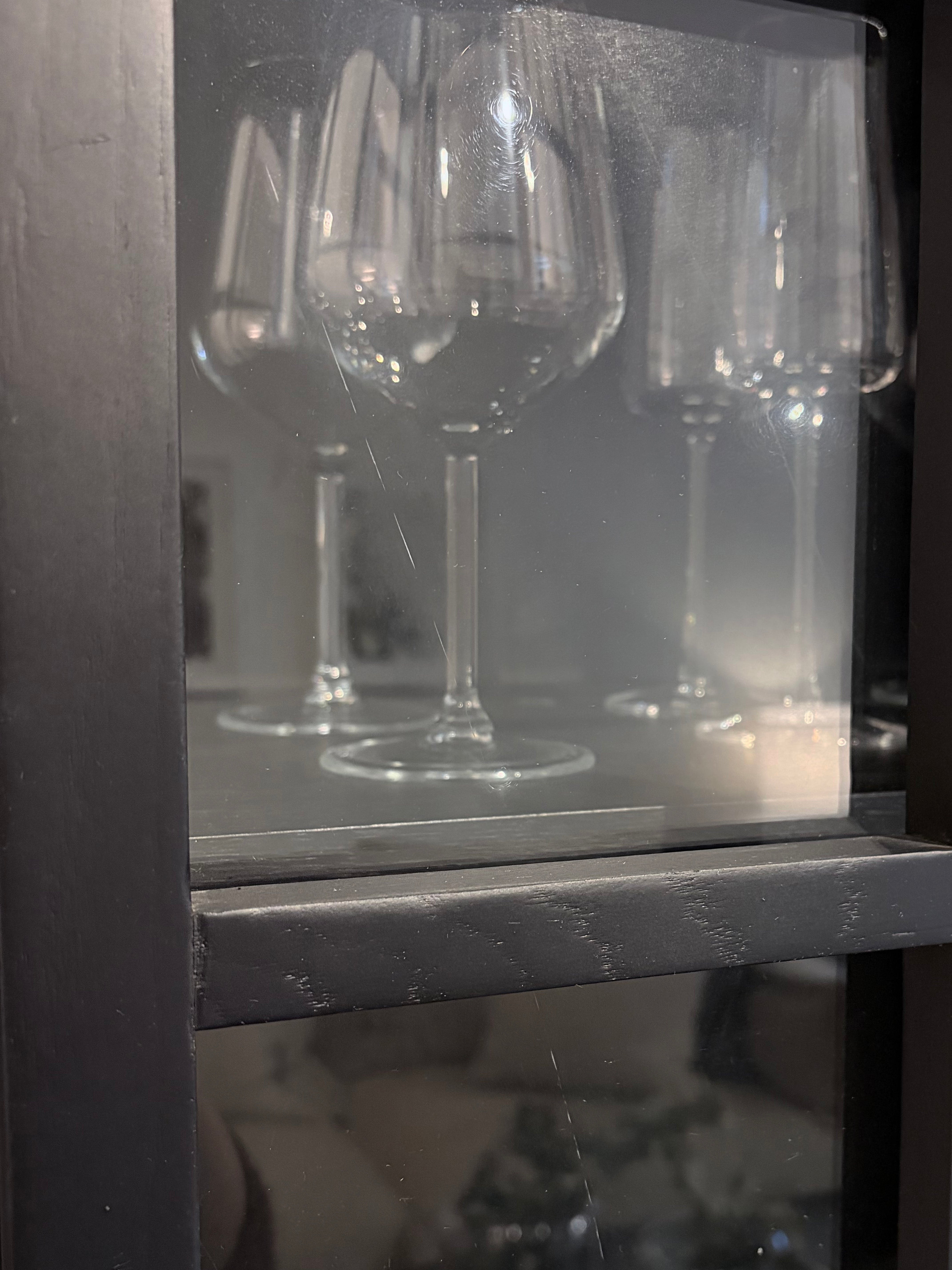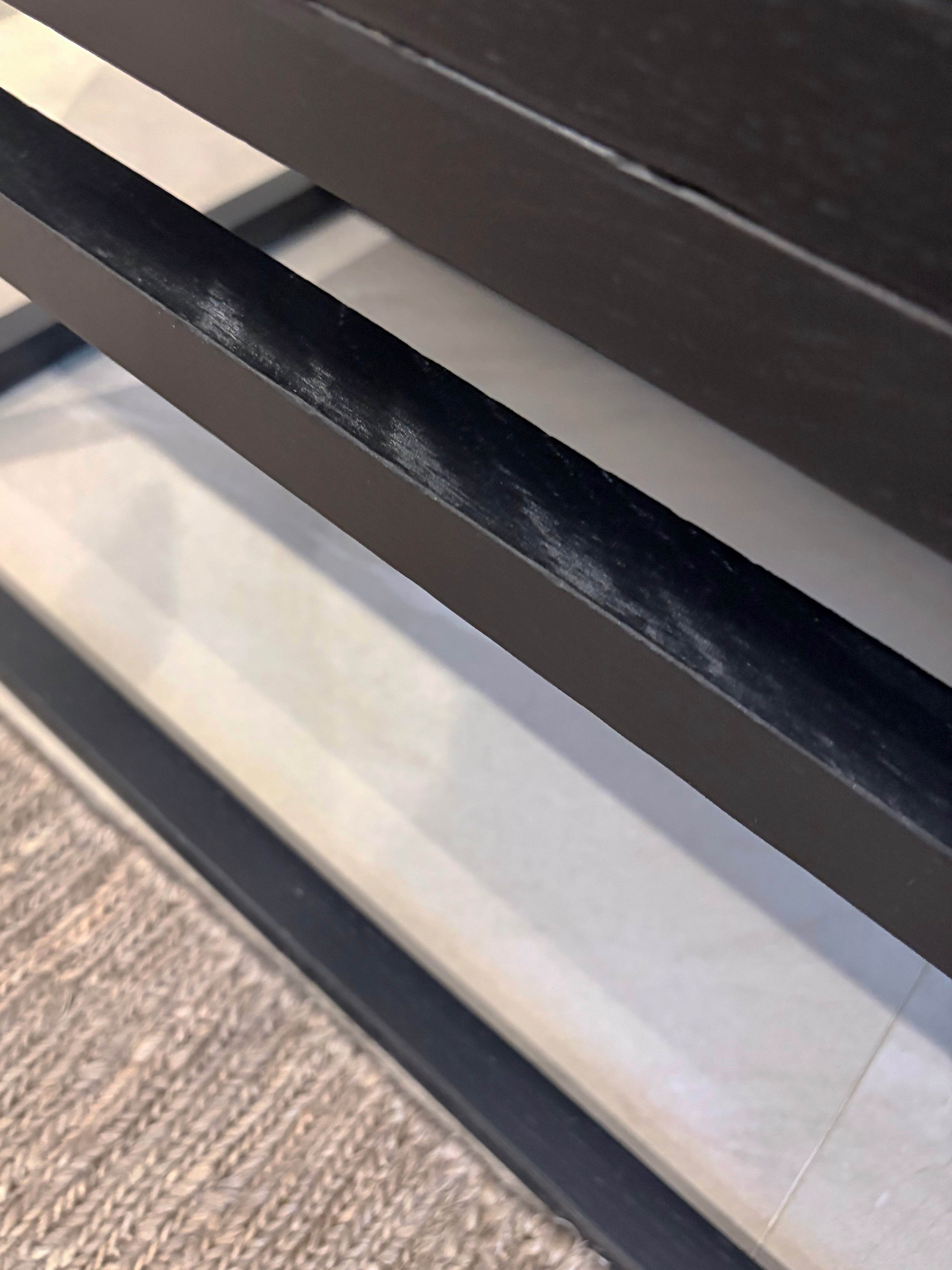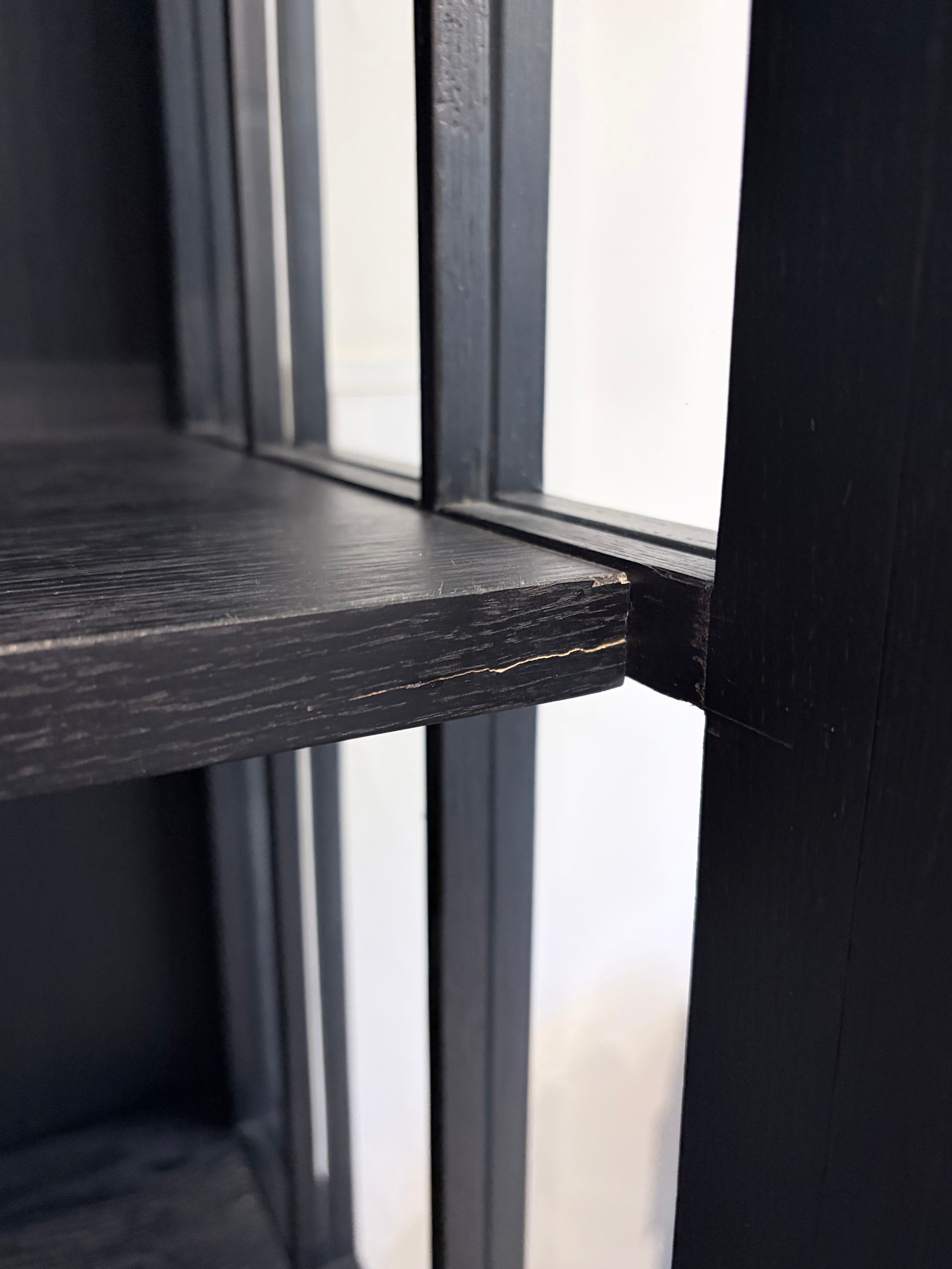 Since the piece was used in showroom display and photo shoots, there are minor surface deformations on the wood and light silicone marks on the glass. These do not affect its overall appearance or functional quality.